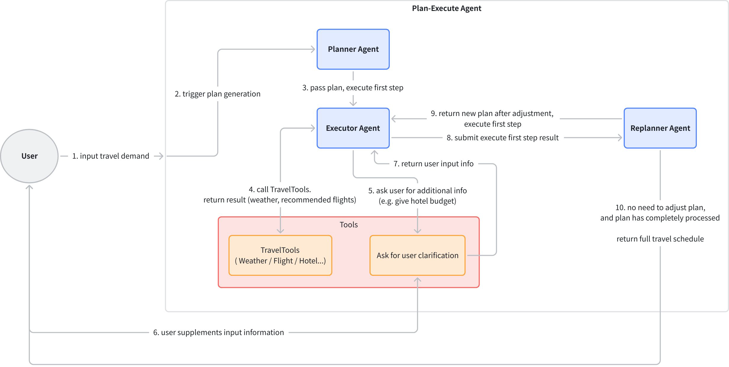 plan‑execute exampleImplements a plan‑execute‑replan travel planner: Planner generates stepwise plan; Executor calls mock tools (get_weather/search_flights/search_hotels/search_attractions/ask_for_clarification); Replanner decides replan or finish. Two layers: