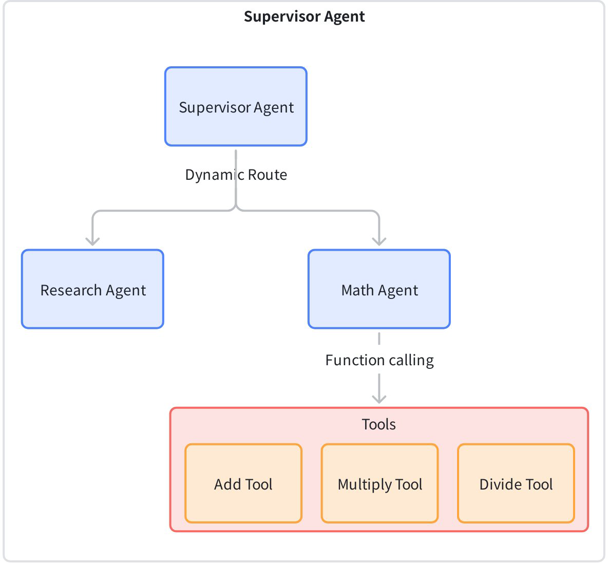 • supervisorSingle‑layer Supervisor manages two composite subagents: Research Agent (retrieval) and Math Agent (math operations: add/multiply/divide). All math ops are handled by one Math Agent rather than splitting into many; suitable for focused tasks and quick deployment.