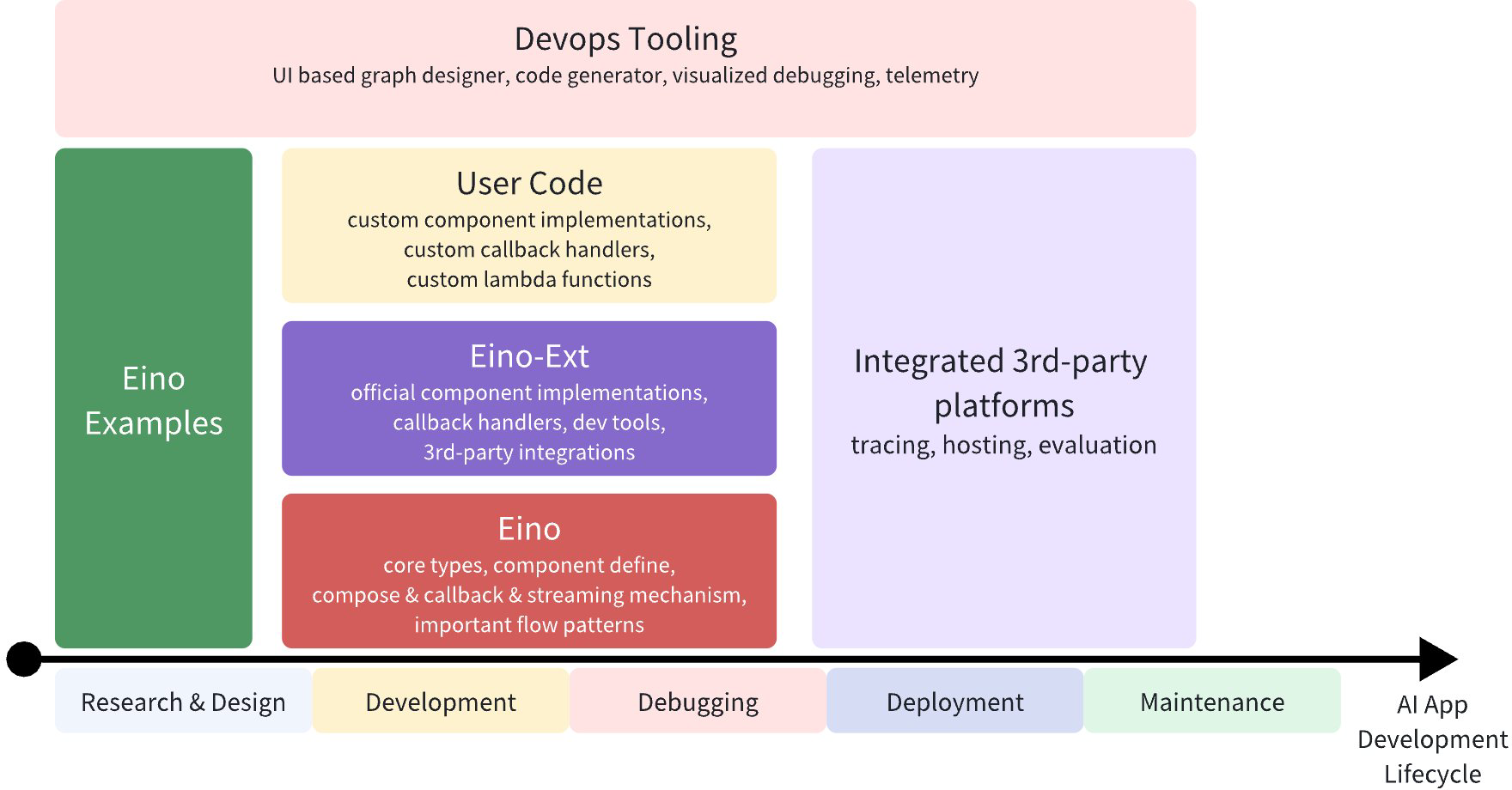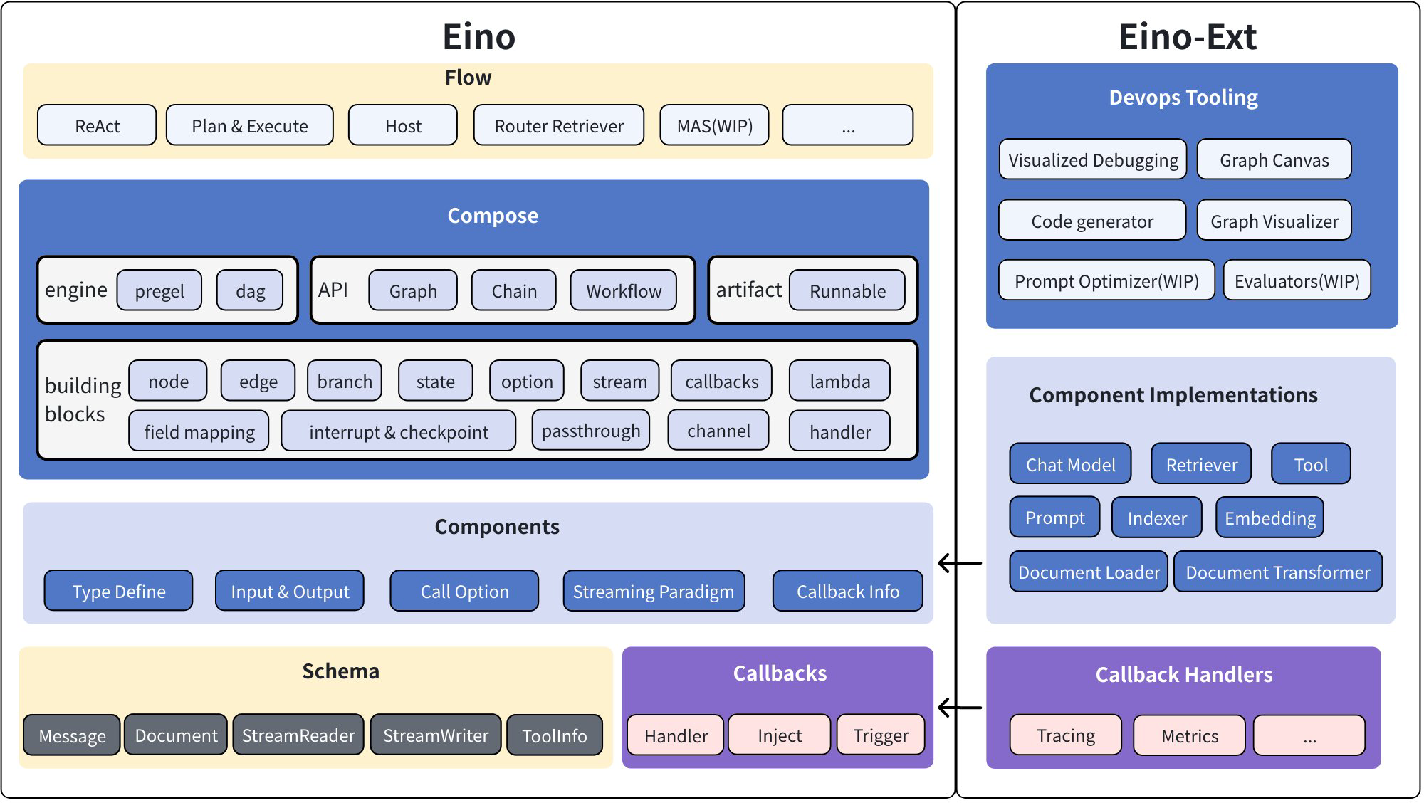• Eino: Type definitions, streaming mechanisms, component abstractions, orchestration, and callbacks.